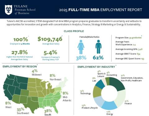 100% of the Freeman Full-Time MBA class of 2025 accepted job offers by four months post-graduation earning an averagy base salary of $109,746 annually. Read the entire Full-Time MBA Employment Report to learn more.